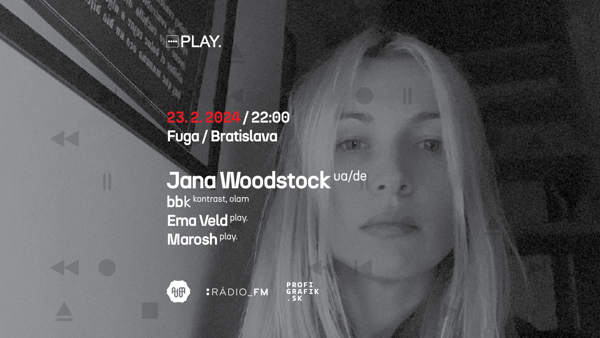 Šieste výročie konceptu PLAY. prináša do bratislavskej Fugy zvučné meno svetovej alternatívnej elektronickej scény. Z Berlína dorazí Jana Woodstock, Djka a producentka z Kyjeva, ktorá si zaslúžene vydobyla na scéne svoje postavenie a ktorá ma za sebou silné medzinárodné publikum. Doplní ju bbk z bratislavského OLAM collective a rezidenti eventu Marosh a Ema Veld.